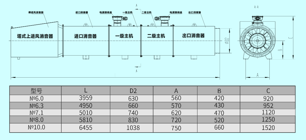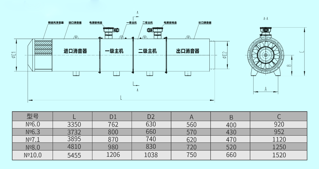 2、风机设计有进风口塔式消音器、进口和出口配有螺旋复合式消音筒、采用阻抗复合式消音,有效降低风机噪音。