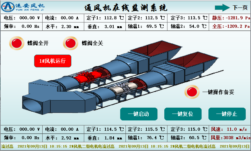 (3)两台通风机配备一套通风机在线监测装置,各自独立的两套传感器,能方便地切换使用;