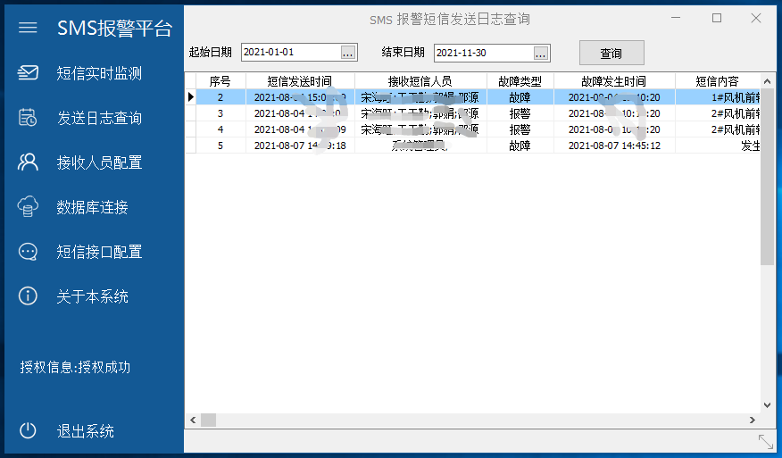 本系统通过阿里大于短信平台,能实现对机风各种类型的报警信息(故障信息、报警信息、警告信息)进行实时短信推送,通过系统设置功能,设置接收短信报警信息人员。